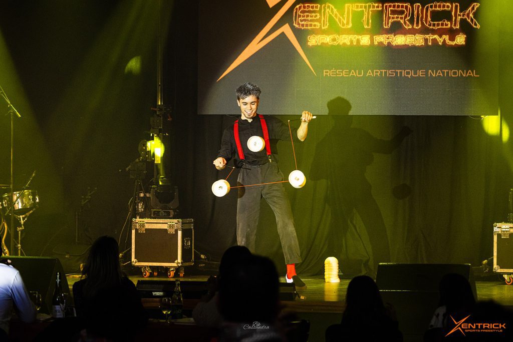 À travers une performance aérienne de diabolo spectaculaire, l’artiste enchaîne figures de haute précision et envolées vertigineuses… jusqu’au moment où tout semble lui échapper. Cordes qui s’emmêlent, trajectoires imprévisibles, situations absurdes : ce qui pourrait être un échec devient alors un véritable terrain de jeu, mêlant humour, autodérision et virtuosité.